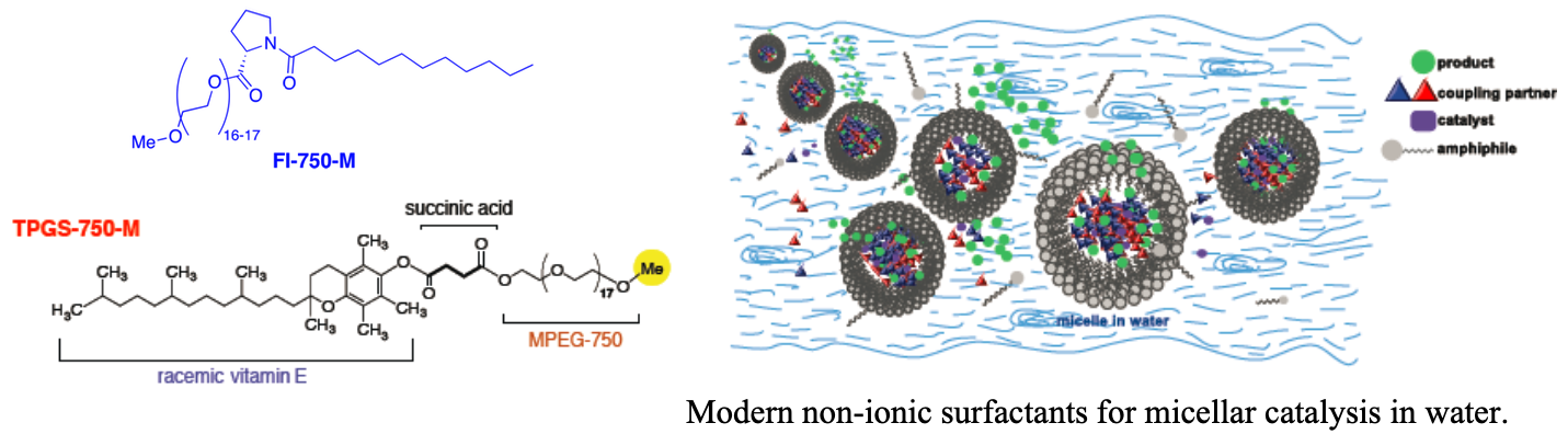 These surfactant mediated reactions can be up-scaled in the already existing multi-purpose facilities of pharmaceutical or chemical organizations, using a catalytic amount of a combination of a non-ionic designer surfactant (e.g. TPGS-750-M, FI-750-M) in water, and a well-chosen organic co-solvent instead of traditional and undesirable organic solvents.(6) We now start gaining insight onto the physical phenomena involved and the role of the various components of the system and utilize this know-how to design even better catalytic systems.(7)